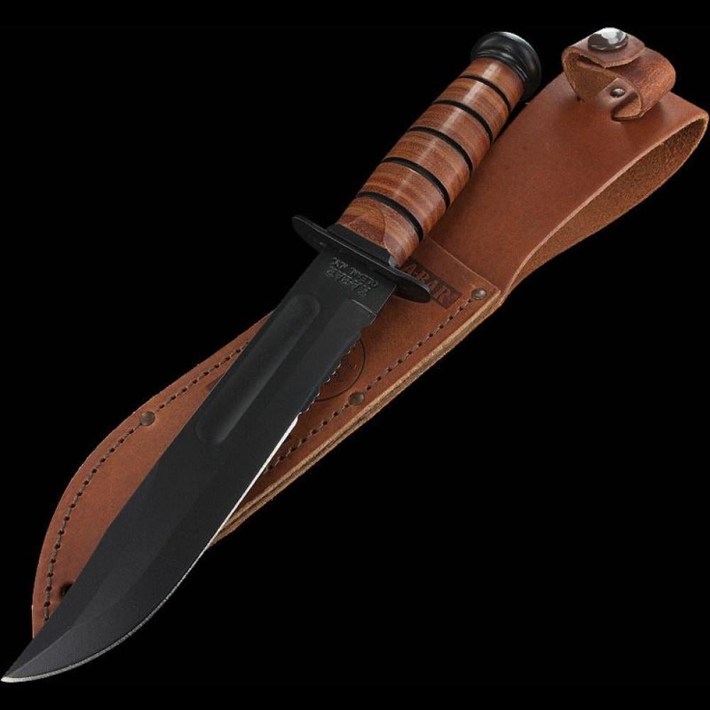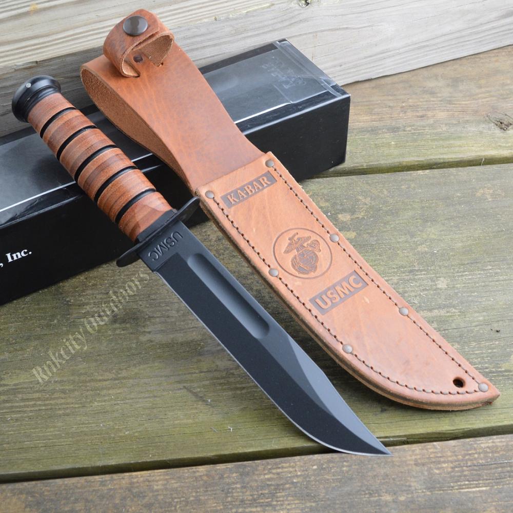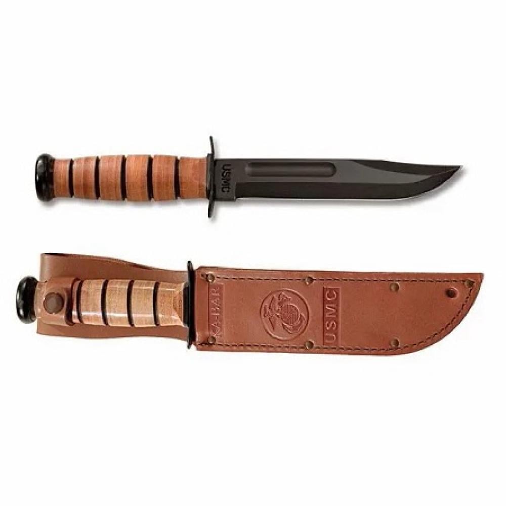 تتميز السكين برأسها المدبب الشهيرة، حيث يتم طرق وفحص فولاذ 1095 كرو-فان بعناية لضمان أن كل سكين قوية ودائمة بينما تبقى سهلة الشحذ للحصول على حافة حادة. المقابض المصنوعة من الجلد المكدس ملتصقة معًا ومشكلة في الشكل البيضاوي المألوف، مما يجعل السكين مريحة في اليد وتوفر سيطرة ممتازة وتماسكاً محكمًا. بين واقي الأصابع والمقبض، تبقى سكين كا-بار آمنة في اليد في أي مهمة كانت. الغمد الجلدي منقوش عليه شعار USMC تضيف إلى الجاذبية الجمالية للسكين مع إمكانية حمل آمن على الحزام.