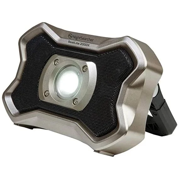 إن NightSearcher BeatLite 2000x هو مصباح عمل محمول وقابل لإعادة الشحن مع مكبرات صوت ستيريو بلوتوث مدمجة وميزة بنك الطاقة. مما يسمح لك بالاستماع إلى مقاطعك المفضلة أثناء العمل، وشحن أجهزتك المحمولة أثناء التنقل.