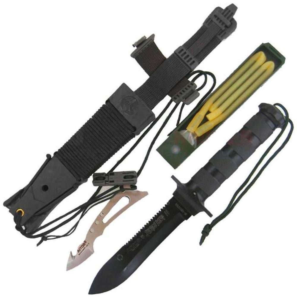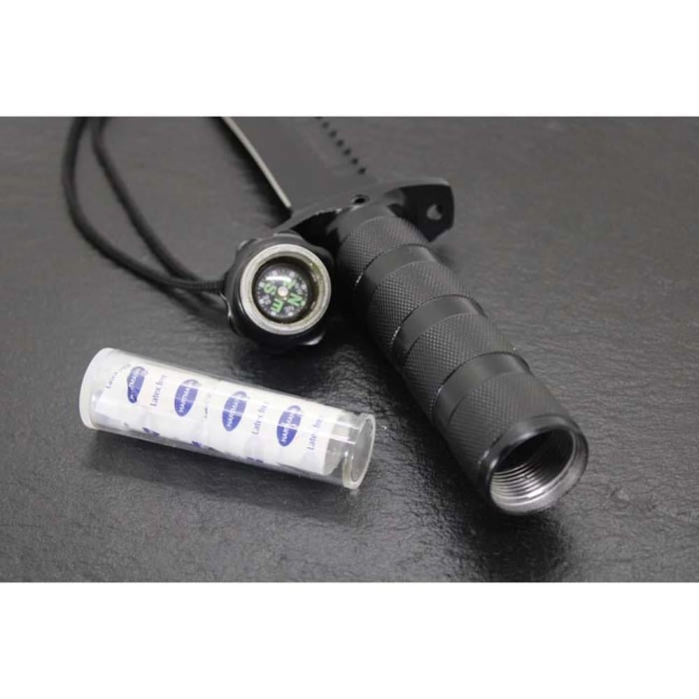 The survival equipment is housed either in the handle of the knife or in the sheath.