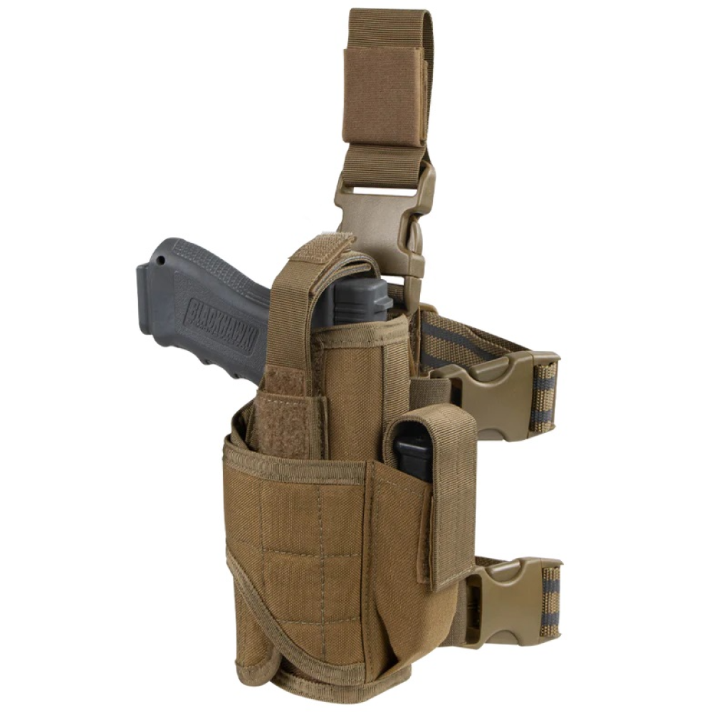 Keep your sidearm securely stored with the Condor Tornado Leg Holster. This tactical leg holster is fully adjustable, allowing it to accommodate a wide range of weapon sizes, including everything from a standard sidearm to a sidearm with a laser or light attachment. Simply use the retention system with a built-in hook and loop strap to secure your weapon. The holster also features one pistol mag pouch with an adjustable flap, ensuring that it will fit your sidearm's magazine dimensions. An anti-slip rubber lining keeps the holster comfortably in place throughout any movement while wearing the Condor Tornado tactical leg holster.