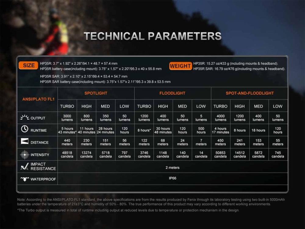 Made for the professional and built for the extremes, the Fenix HP35R Rechargeable Professional Headlamp is built to perform. The rotary and button combo switch allows you to choose between different levels of spotlight, floodlight, or both—for a jaw-dropping 4000 max lumens with an almost 500-yard throw. The battery pack contains two built-in 5000mAh batteries and can be used as a power bank to charge other devices. Built into the battery case is a red safety light used for alerting others to your location. Comes with a perforated black-out strap.