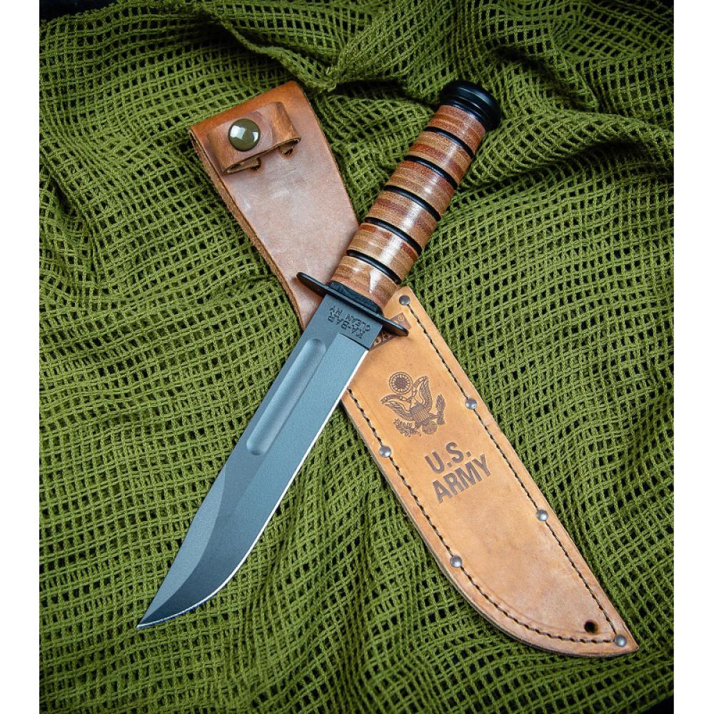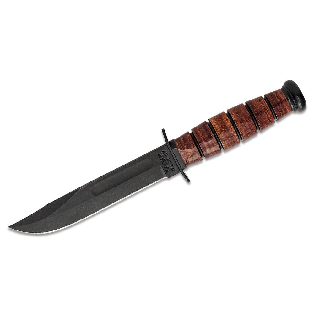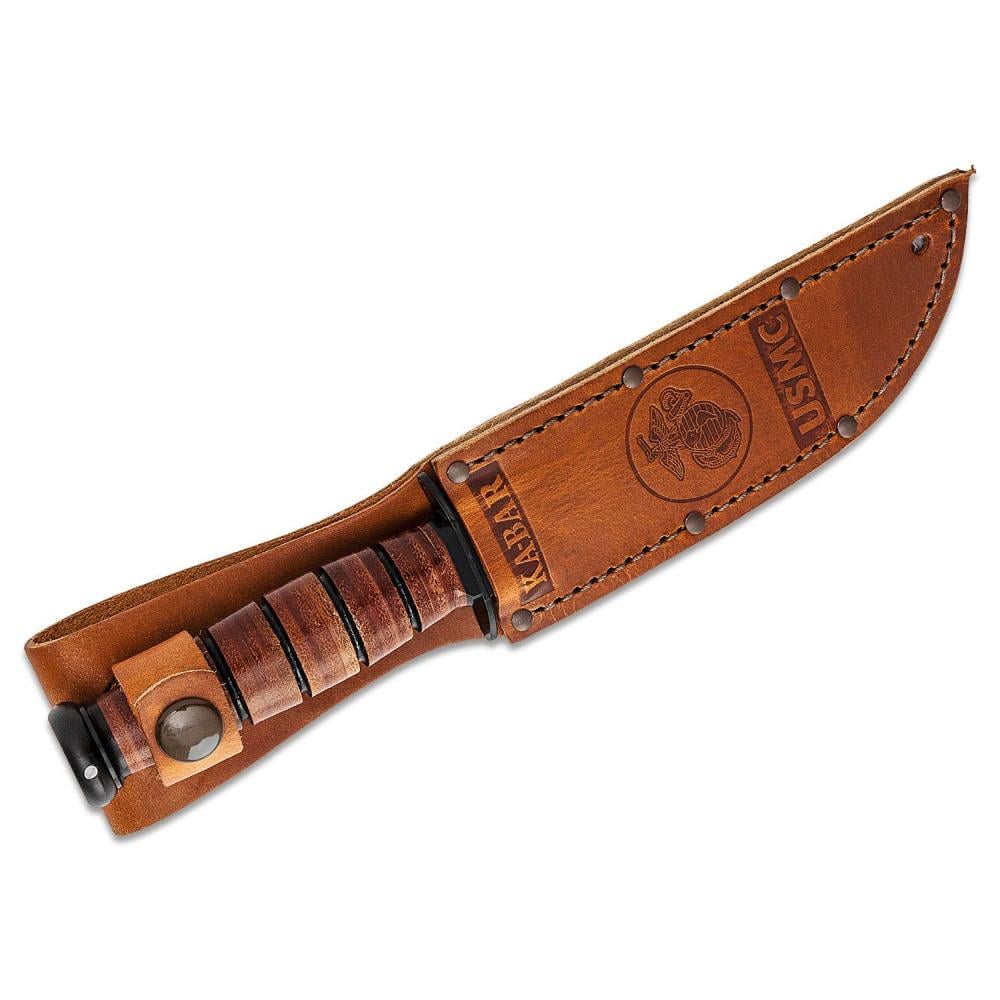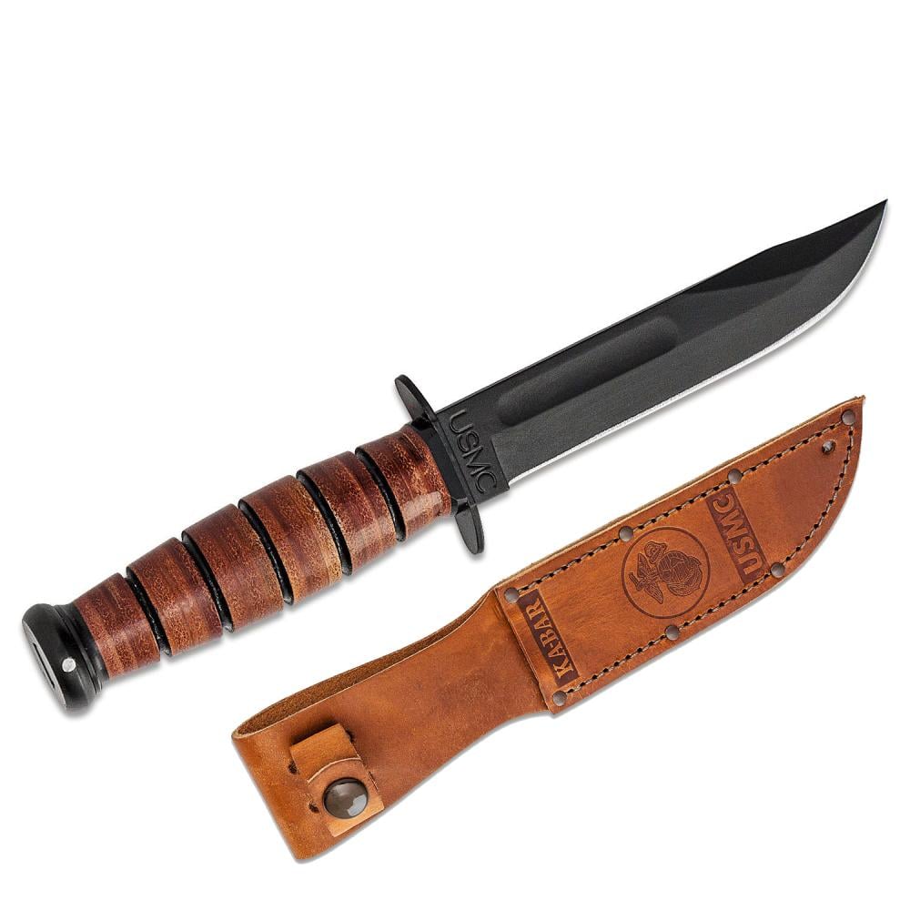 Featuring the iconic clip point blade, 1095 Cro-Van steel is painstakingly ground and heat treated to ensure each knife is tough and durable while remaining easy to sharpen to a hair-popping edge. Stacked leather handles are bonded together and contoured into the familiar oval shape, comfortable in hand while providing excellent traction and control. Safely nestled between the finger guard and pommel, the Ka-Bar Fighting/Utility knife remains secure in hand whether you're in close-quarters combat or blazing a trail through thick vegetation. The embossed USMC brown leather sheath adds to the aesthetic appeal of the knife with a secure belt carry.